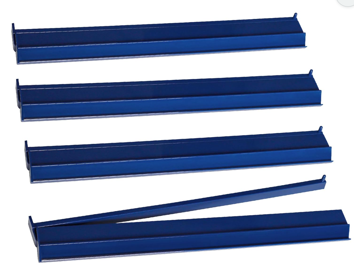 Navy rack and pusher set made of high quality plastic, each measuring 17.8 x 3.1 x 1.2 inches, suitable for American Mahjong tiles (1.2”). The pushers are permanently attached to the racks, eliminating the need for assembly or disassembly.
